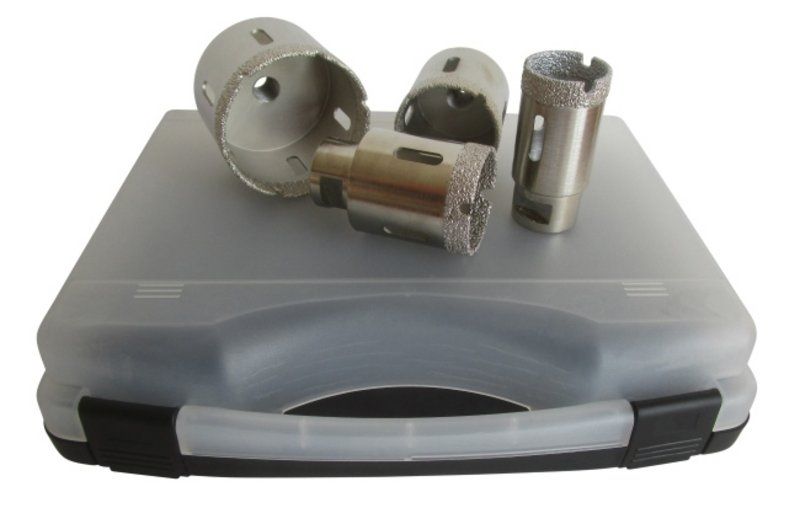 Praktikus, 3 darabos készlet minden szerelő számára, viasszal töltött üreges fúrófejekkel. Praktikus, 4 -5 darabos készlet minden burkoló számára. Praktikus, 14 darabos készlet mindenki számára, amely 6-12 mm-es, viasszal töltött fúrófejeket, valamint 20-82 mm átmérőjű fúrókat tartalmaz.