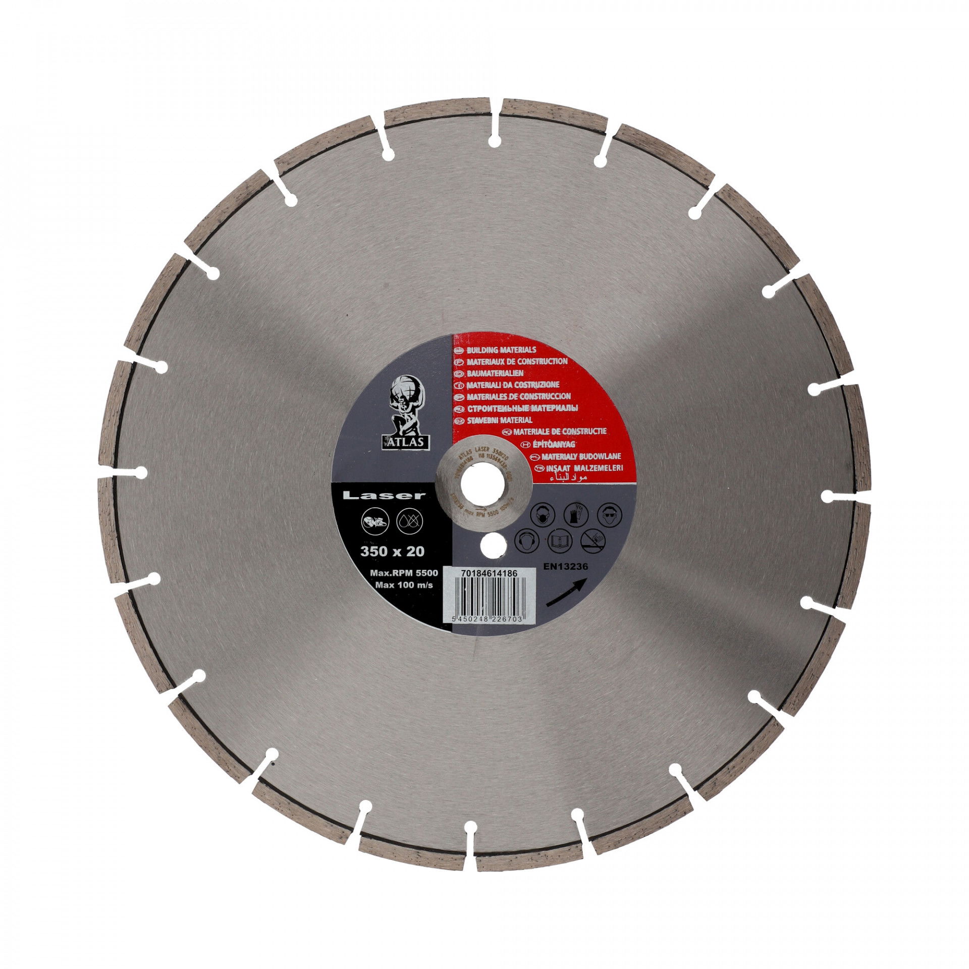 Atlas Laser gyémánt vágókorong kiváló minőségű anyagból készült, megnöveli az élettartamot és a teljesítményt. Száraz és nedves vágáshoz tervezve. A szegmentált profilnak és a lézer hegesztésnek köszönhetően a vágókorong könnyen megbirkózik a különféle kemény anyagok vágásával, anélkül, hogy hosszú időn keresztül elveszítené tulajdonságait. Minőségi eszköz magas igényekhez, kiváló ár-teljesítmény arány, magas gyémántkoncentráció, tiszta vágás. Alkalmazási területek: beton, útburkolat, tetőcserép, gránit, márvány, általános építőanyagok.