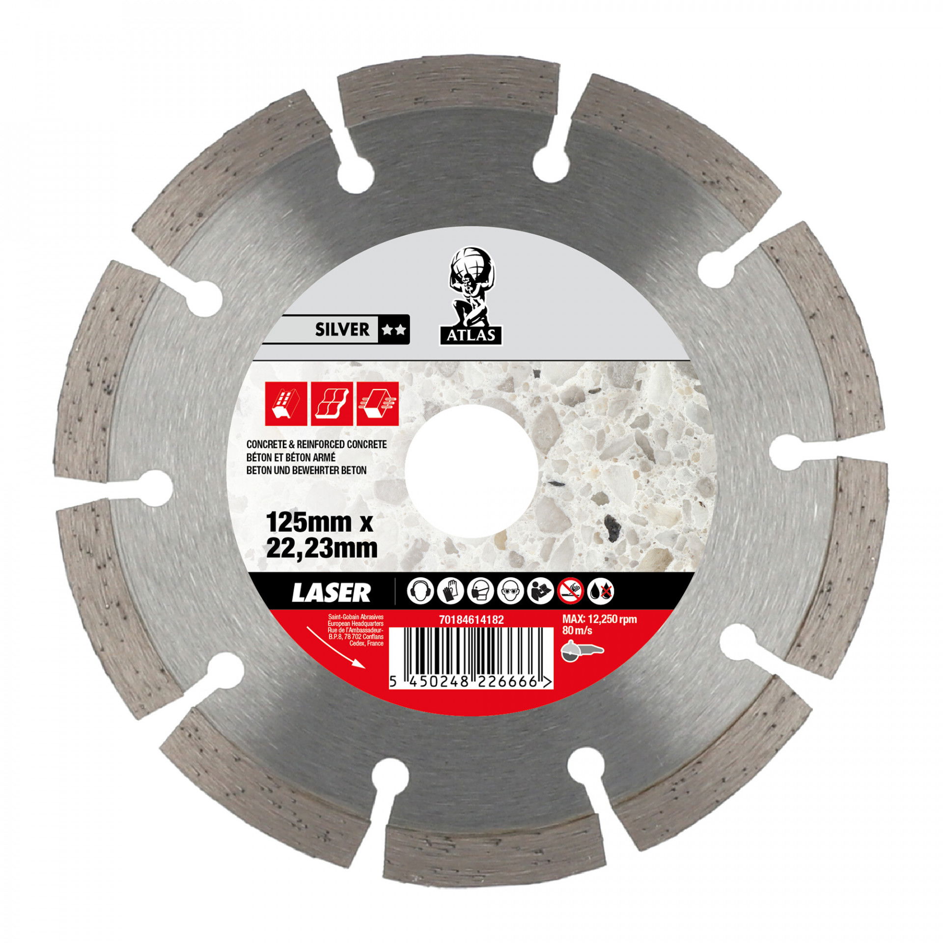 Atlas Laser gyémánt vágókorong kiváló minőségű anyagból készült, megnöveli az élettartamot és a teljesítményt. Száraz és nedves vágáshoz tervezve. A szegmentált profilnak és a lézer hegesztésnek köszönhetően a vágókorong könnyen megbirkózik a különféle kemény anyagok vágásával, anélkül, hogy hosszú időn keresztül elveszítené tulajdonságait. Minőségi eszköz magas igényekhez, kiváló ár-teljesítmény arány, magas gyémántkoncentráció, tiszta vágás. Alkalmazási területek: beton, útburkolat, tetőcserép, gránit, márvány, általános építőanyagok.