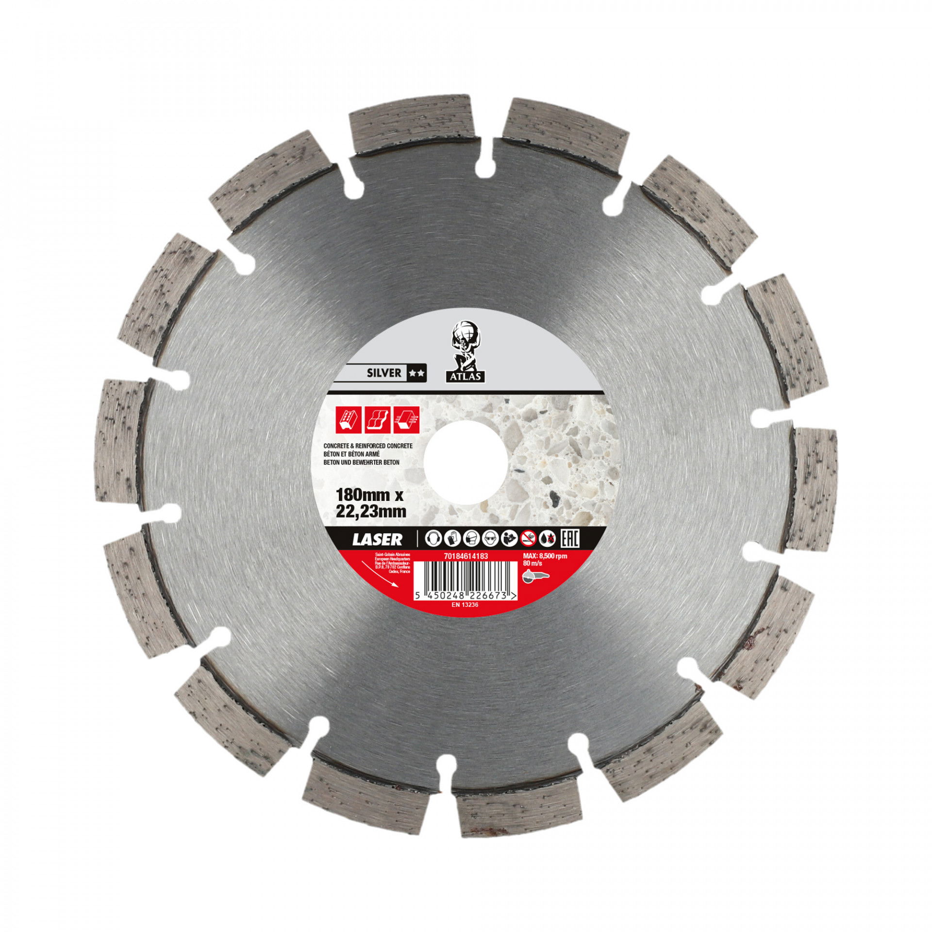 Atlas Laser gyémánt vágókorong kiváló minőségű anyagból készült, megnöveli az élettartamot és a teljesítményt. Száraz és nedves vágáshoz tervezve. A szegmentált profilnak és a lézer hegesztésnek köszönhetően a vágókorong könnyen megbirkózik a különféle kemény anyagok vágásával, anélkül, hogy hosszú időn keresztül elveszítené tulajdonságait. Minőségi eszköz magas igényekhez, kiváló ár-teljesítmény arány, magas gyémántkoncentráció, tiszta vágás. Alkalmazási területek: beton, útburkolat, tetőcserép, gránit, márvány, általános építőanyagok.