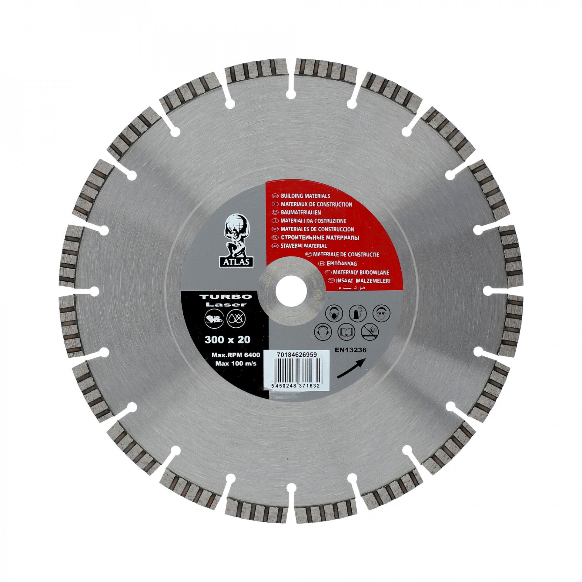 Az Atlas Turbo Laser gyémánt vágókorongot nagyon hosszú élettartam jellemzi többek között a lézerhegesztett szegmenseknek köszönhetően. Minőségi eszköz magas igényekhez, kiváló ár-teljesítmény arány, magas gyémántkoncentráció, tiszta vágás. Alkalmazási területek: beton, útburkolat, tetőcserép, gránit, márvány, általános építőanyagok. Vizes és száraz vágáshoz.
