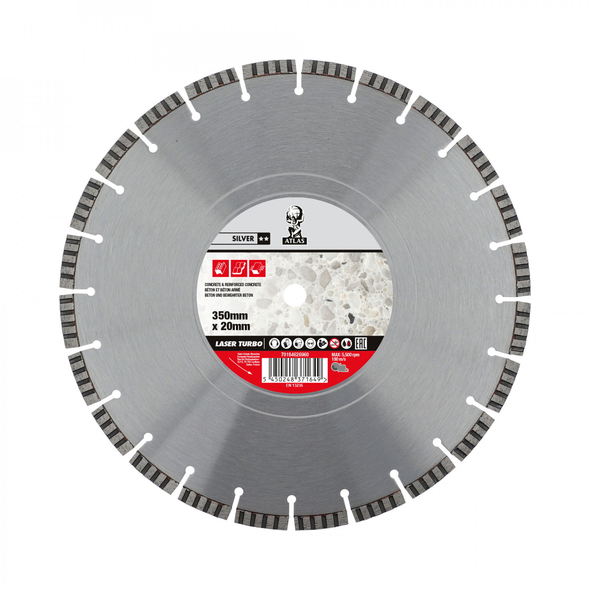 Az Atlas Turbo Laser gyémánt vágókorongot nagyon hosszú élettartam jellemzi többek között a lézerhegesztett szegmenseknek köszönhetően. Minőségi eszköz magas igényekhez, kiváló ár-teljesítmény arány, magas gyémántkoncentráció, tiszta vágás. Alkalmazási területek: beton, útburkolat, tetőcserép, gránit, márvány, általános építőanyagok. Vizes és száraz vágáshoz.