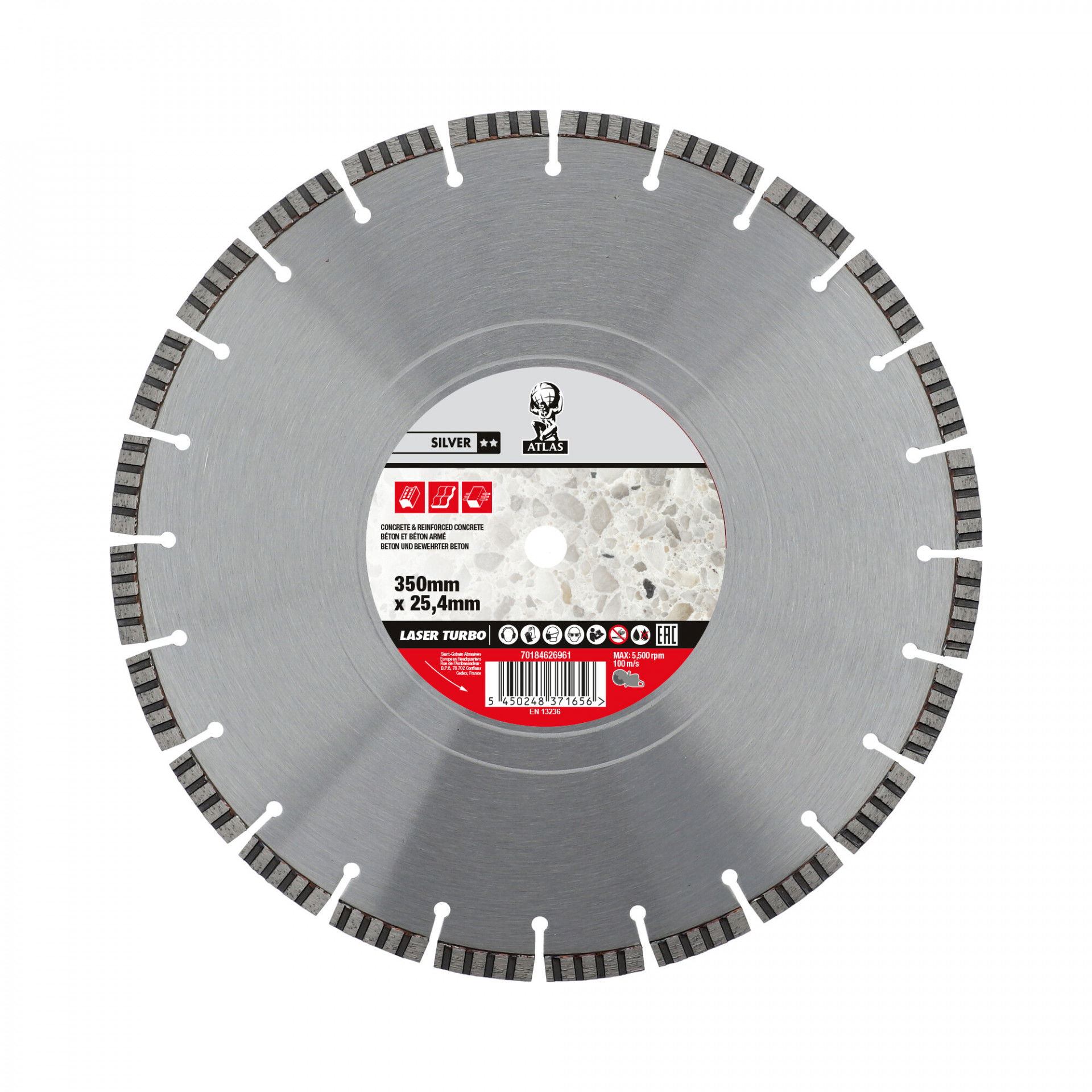 Az Atlas Turbo Laser gyémánt vágókorongot nagyon hosszú élettartam jellemzi többek között a lézerhegesztett szegmenseknek köszönhetően. Minőségi eszköz magas igényekhez, kiváló ár-teljesítmény arány, magas gyémántkoncentráció, tiszta vágás. Alkalmazási területek: beton, útburkolat, tetőcserép, gránit, márvány, általános építőanyagok. Vizes és száraz vágáshoz.