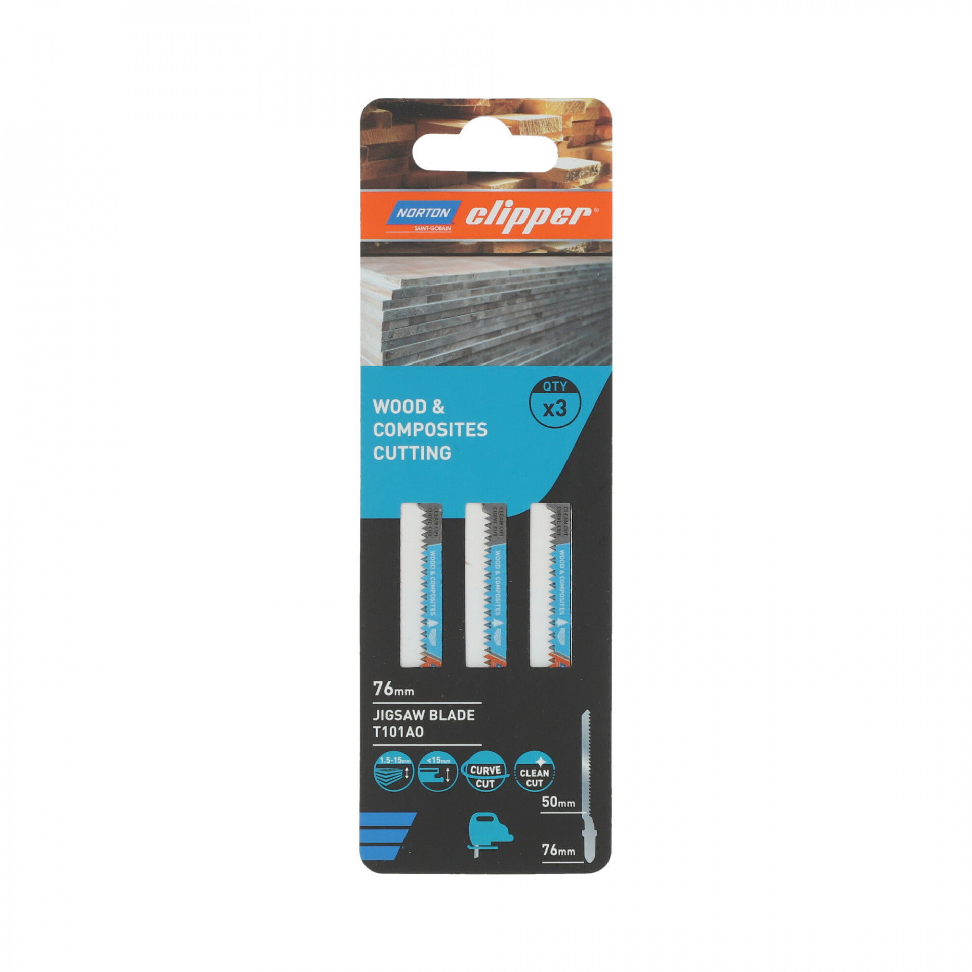 A Norton Clipper szúrófűrészlap segítségével a felhasználó gyorsan és egyszerűen vághat természetes és építőipari fát. HCS szénacélból készült, melynek köszönhetően tökéletesen vágja a puha anyagokat, vastag szerkezetű fűrészárut, puhafát (5-65 mm), forgácslapot, rétegelt lemezt, farostlemezt. A precízen élezett fogak egyenes, sorjamentes vágást biztosítanak kifogástalan eredménnyel.