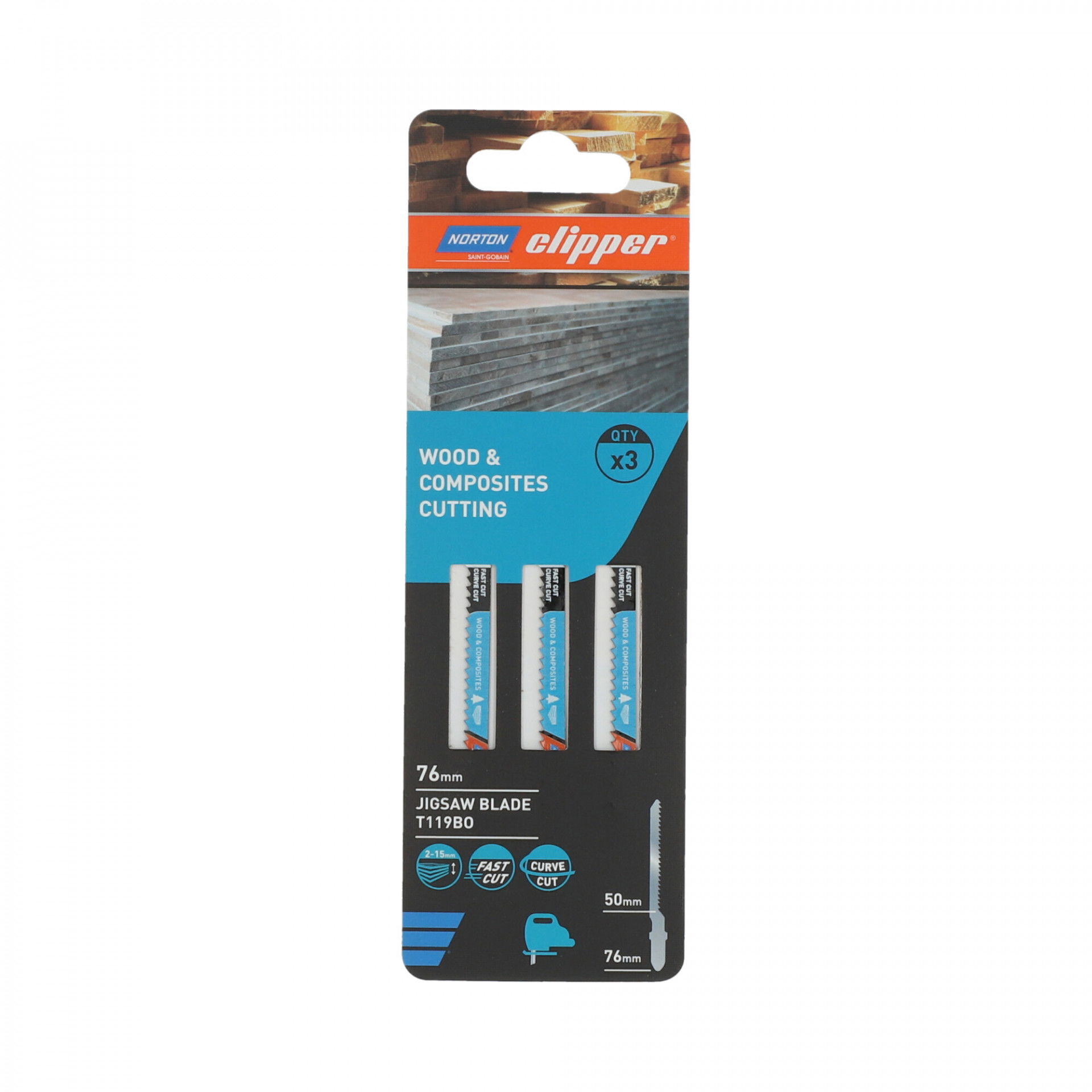 A Norton Clipper szúrófűrészlap segítségével a felhasználó gyorsan és egyszerűen vághat természetes és építőipari fát. HCS szénacélból készült, melynek köszönhetően tökéletesen vágja a puha anyagokat, vastag szerkezetű fűrészárut, puhafát (5-65 mm), forgácslapot, rétegelt lemezt, farostlemezt. A precízen élezett fogak egyenes, sorjamentes vágást biztosítanak kifogástalan eredménnyel.