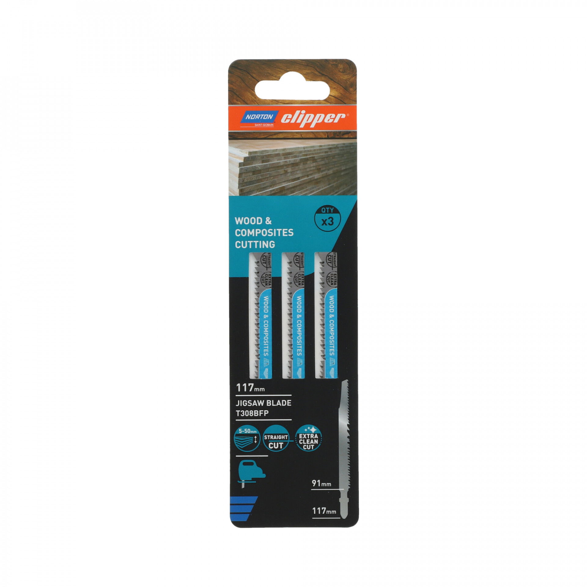 A Norton Clipper szúrófűrészlap segítségével a felhasználó gyorsan és egyszerűen vághat természetes és építőipari fát. HCS szénacélból készült, melynek köszönhetően tökéletesen vágja a puha anyagokat, vastag szerkezetű fűrészárut, puhafát (5-65 mm), forgácslapot, rétegelt lemezt, farostlemezt. A precízen élezett fogak egyenes, sorjamentes vágást biztosítanak kifogástalan eredménnyel.