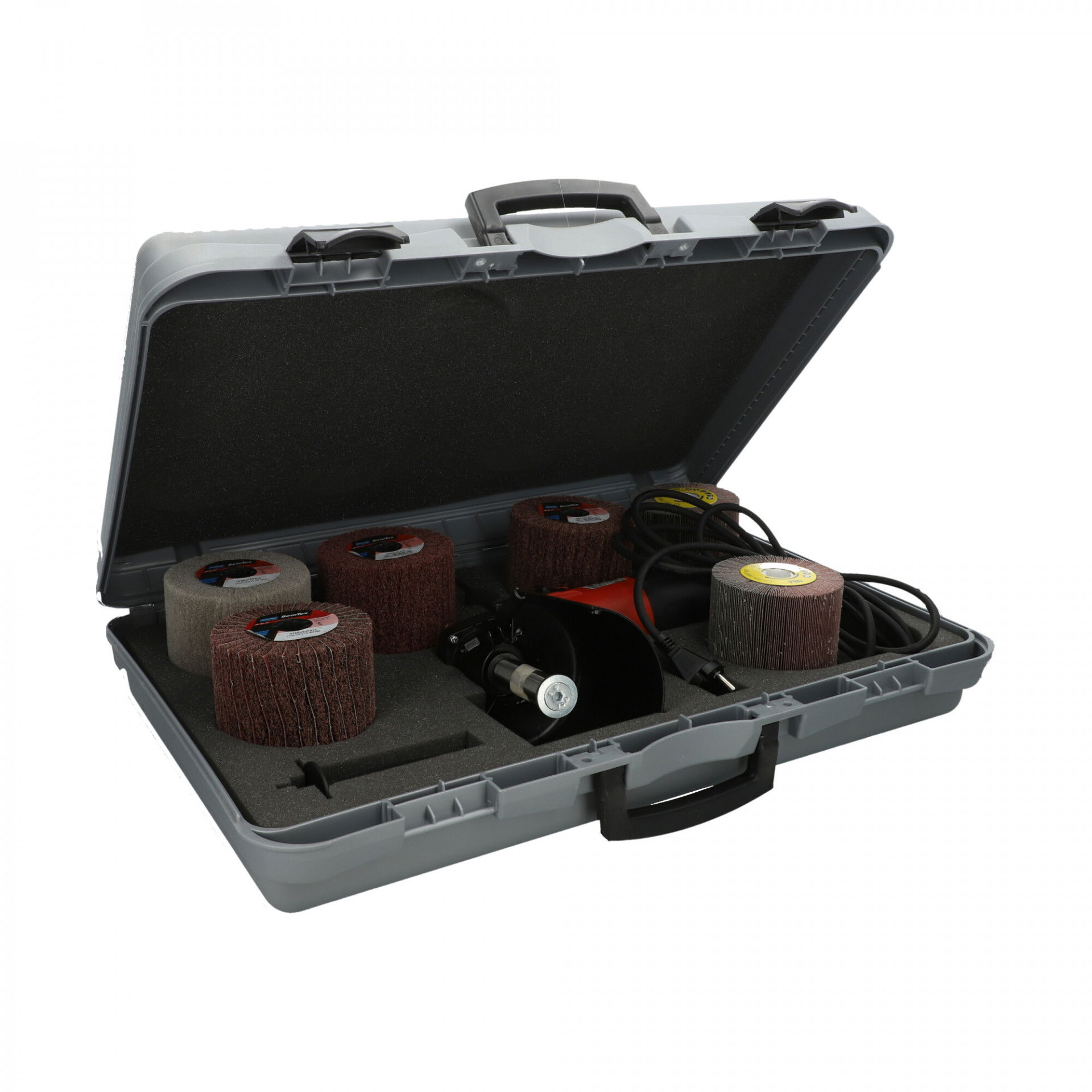Egy praktikus hordozható fémcsiszoló és finiselő készlet, amely egy elektromos kefegépet és 6 különféle csiszolóhengert tartalmaz,választhatóan valamennyi fém megmunkálásához. Anyagleválasztás, felületösszedolgozás ,szálrahúzás és fémpolírozás. Kofferban szállítva.